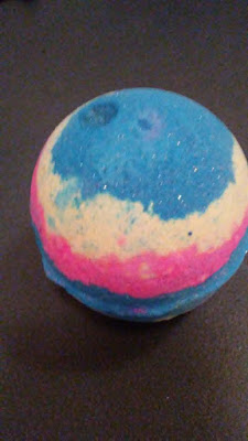 We are also currently working in the Hake/Saxon Grammar and Writing 3. Again, Issac is using a lower grade level than he's in, but he's had such trouble remembering parts of speech that I felt this was a better fit. We are still working in the A+ Interactive Math (by A+ TutorSoft Inc.), but didn't have the computer with us. Issac has been reviewing adding 5 digit numbers with 4 digit numbers and 4 digit numbers with 3 digit numbers. I just wrote some problems down on paper for him to work through. He also managed to do a lesson in his Spelling Workout C. All in all a pretty good day for working outside as well as school. When I got home I was SUPER sore from working, so I was able to use the bath bomb my daughter-in-law purchased for me recently. She couldn't believe I hadn't had one of the huge bombs from Lush.  This is the one she picked out for me and it was pretty cool! My water was bluish with swirls of other colors as well.